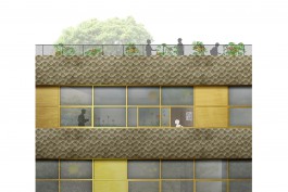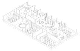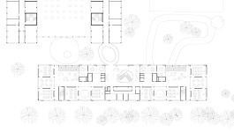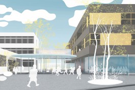 Die gesamte Erdgeschossebene wird als optisch zusammenhängender Ort der Pause & Erholung ausgebildet. Mit sanft geschwungenen Formen wird Raum für die Mensa und den Pausenhof geschaffen. Die beiden Obergeschosse bilden darüber ein schützendes Dach – gleichsam als „fliegende Klassenzimmer“.