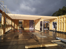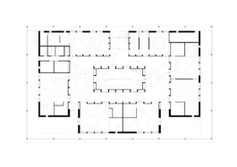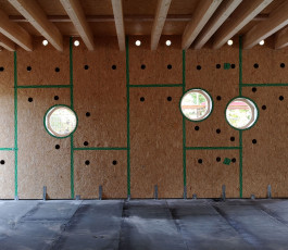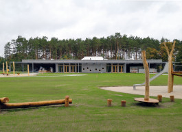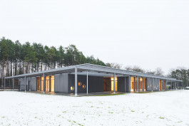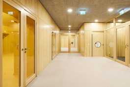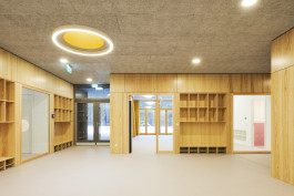 Dieser Flachbau in Holzbauweise gruppiert sich um einen zentralen Bewegungsraum, das Herz der Kita. Um dieses Zentrum legen sich die Spieldielen, die gleichzeitig Raum für Ankunft, Garderobe und freies Spiel bieten. Die eigentlichen Gruppenräume sind altersgerecht aufgeteilt und haben ihrerseits eine überdachte Terrassenfläche als Übergangsraum zwischen Innen und Außen.