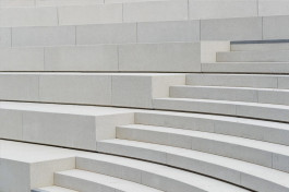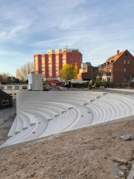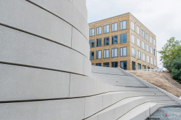 Die Freitreppe nimmt die Richtung der Verbindungsachse zum Klinikum auf. Durch deren Transformation in eine elegante Kurve verschmilzt die Freitreppe mit dem Gelände und wird dessen selbstverständlicher Bestandteil als Landschaftselement, das im südöstlichen Bereich bepflanzt ist. Der Geländesprung wird so genutzt, um einen Ort mit hoher Aufenthaltsqualität zu schaffen.