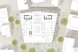 Das zu ebener Erde liegende Wohnzimmer öffnet sich über die gesamte Hausbreite mit einladender Glasfassade zum Sternenplatz. Foyer, Café und Flexbereich gehen darin fliessend ineinander über. Sie funktionieren gleichzeitig als Vorzone für Stadtforum und Bibliothek. Das öffentlichen Wohnzimmer ist bewusst einsehbar gestaltet und erlaubt seinerseits Blickbeziehungen vom Inneren hinaus zum Sternenplatz.