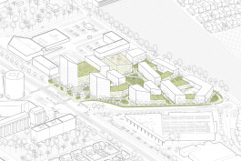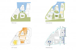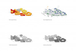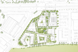 Along Welser Strasse, inviting and extroverted squares seek contact with the surroundings. Behind this, a sequence of more concentrated and introverted squares with different characters develops towards the interior of the quarter, above all the central square. The two south-east-facing squares are the quietest public spaces in the neighborhood, in keeping with the flattening building height and possible residential use. They are intensively planted with greenery and, with their opening geometry, offer potential for connecting to the green and parking areas of the planned single-family housing estate.