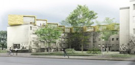 The new housing units on the roof of a residential building from the 1960s are oriented towards the street for good visibility and lighting. They feature open, loft-like floor plans and compact functional “blocks”. The facade not only creates an identity, it also reduces heating loads due to its high reflectivity.