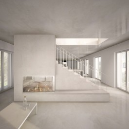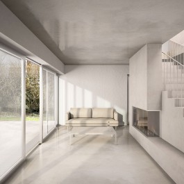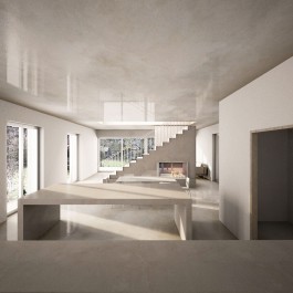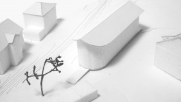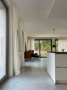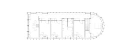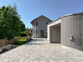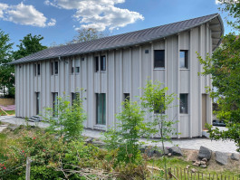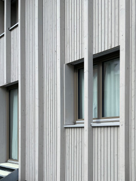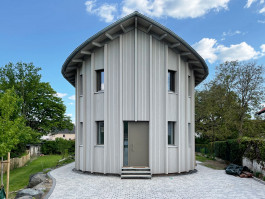 This residential building in solid wood adapts to an elongated plot of land, with the rounding to the north the result of the narrowing of the site. The facade is marked by a wooden structure which frames the windows and other openings.
